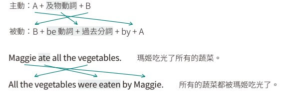 被動語態 英文語態有兩種:主動語態與被動語態,依照語意需要使用,使用時將原句內的受詞移為新句的主詞,將動詞改為 be 動詞 + 過去分詞,再將原句的主詞移為受詞,前置介詞by,如下句型所示: