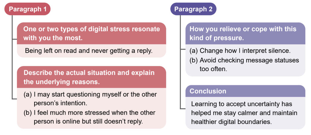 在現代生活中,科技讓我們能隨時聯繫並即時回覆,但同時也帶來新的壓力。請寫一篇英文作文,文分兩段,文長至少 120 個單詞(words),第一段請從下列的數位壓力中選擇一到兩種你最有感的數位壓力並說明實際情況及原因。第二段說明你如何紓解或面對這種壓力,並提出具體做法或個人反思。
