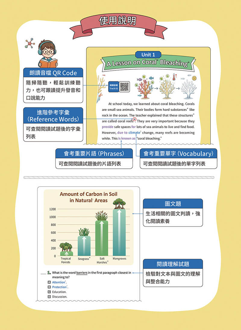 《國中英語閱讀素養核心實力:跨域主題 × 圖文整合 × 閱讀 + 克漏字雙效訓練》正是依據這樣的命題趨勢所規劃。本書精選會考常見的跨領域主題,涵蓋生態與環保、時事議題與流行文化、科學與技術、社會與文化、地理與自然及醫學與保健六大議題,帶領讀者熟悉不同領域的知識以拓展視野,進而提升英語實力與思考深度。同時納入海報、公告、圖表等真實生活圖文文本,以及會考新式漫畫題型,強化圖文整合與情境判讀能力。透過多元文本的閱讀與思考訓練,學生能在不同形式的資訊中建立整合理解與推論的能力,這正是閱讀素養的核心。