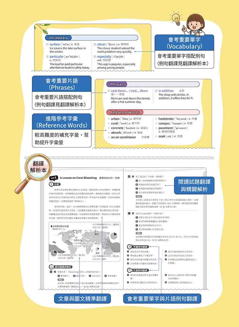 除了完整的閱讀訓練,本書更設計「閱讀 + 克漏字」雙效模式。學生在理解全文脈絡後,透過填補句子缺漏訊息的練習,加深對上下文語意及語法結構的掌握,讓閱讀能力自然銜接語言運用能力。書中並收錄會考核心字彙與片語,搭配實用例句和進階補充,幫助學生在理解文本的同時,累積穩固的語言基礎。另附翻譯解析本,說明題目思路與關鍵線索,引導學生建立正確的解題方法。